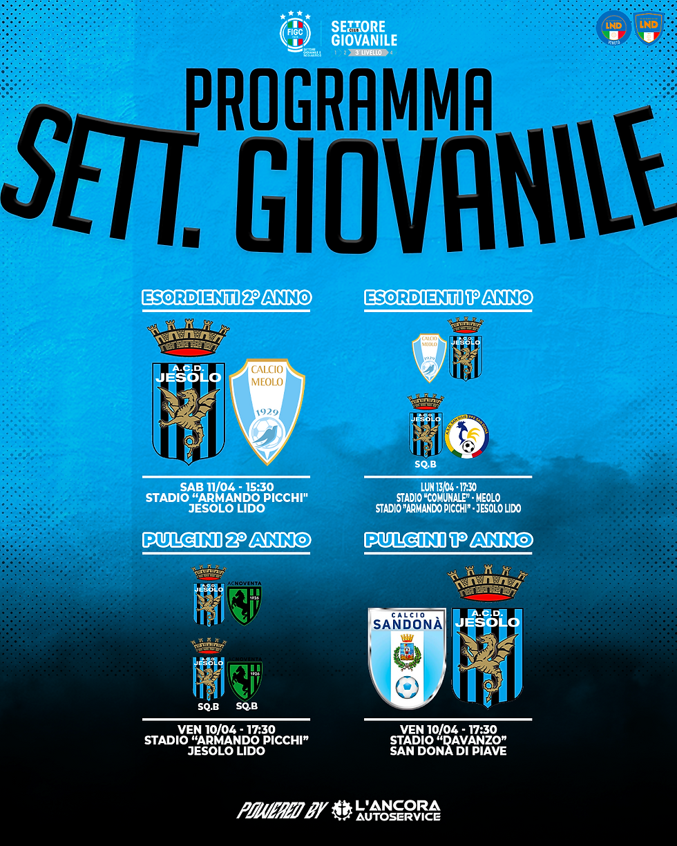 Passata la sosta di Pasqua, si ritorna in campo per l'importantissimo finale di stagione. Lo Jesolo sarà impegnato sabato pomeriggio con la Juniores a Dolo (posticipata alle 16.30), per continuare a sperare nella salvezza e in un miglior piazzamento in vista dei playout. Gli Allievi Regionali anticipano al sabato pomeriggio (16.30 al Picchi) per affrontare l'Eclisse Careni Pievigina, obiettivo strappare ancora punti fondamentali per mantenere la categoria. Domenica mattina ad Istrana i nostri Giovanissimi Regionali, capolista e padroni assoluti del proprio destino in questo campionato, affronteranno il team locale, mentre i Giovanissimi Under 14 saranno all'Antiche Mura per confrontarsi col Vedelago. Nella seconda slide tutte le altre gare in programma per l'attività di base. Forza Jesolo!